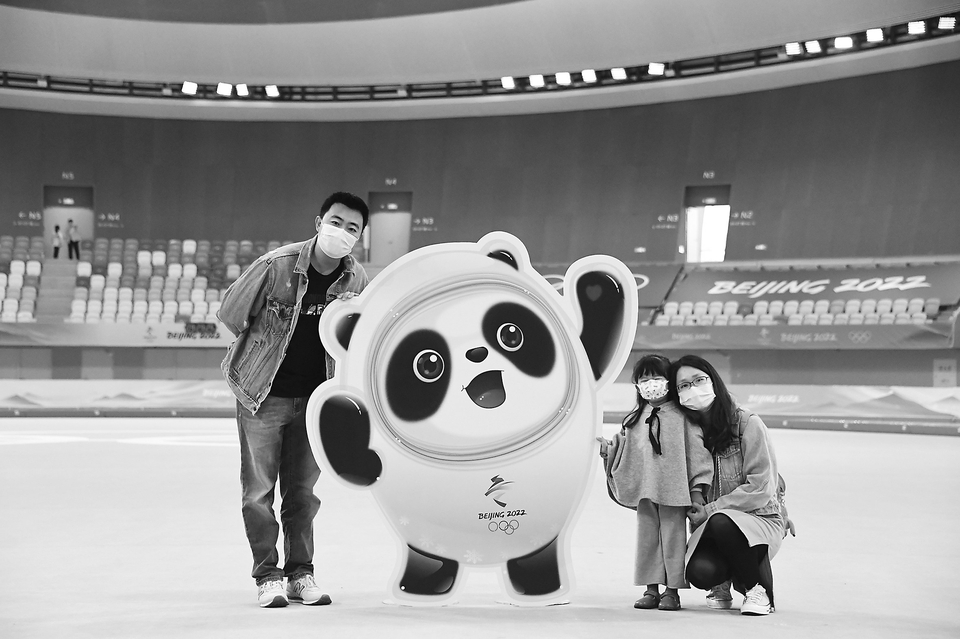 建设者张博伟(左)与家属在国家速滑馆“冰丝带”内与“冰墩墩”合影留念(4月10日摄)。
