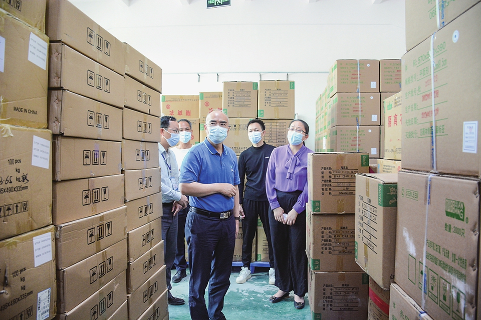 在疫情防控物资仓库,谭剑锋实地查看了解物资的种类、数量、供应、管理等情况。谭剑锋强调,要进一步认识当前形势下防疫物资储备的重要性,完善防控物资保障方案和应急处置预案,规范仓储配比,强化储备物资出入库、调拨管理,做到未雨绸缪、科学储备、灵活调度、安全可靠,为疫情防控工作提供坚实物资保障。