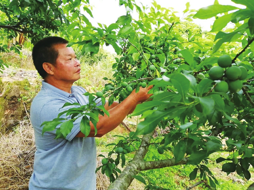 黎某在观察三华李果子生长情况。通讯员黄诒高摄