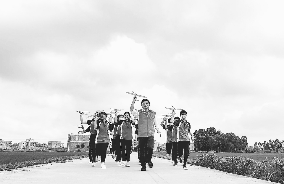 橡筋动力滑翔机完成后,同学们在学校操场、鳌头镇水稻田间开展航模比赛。他们放飞手中的航模,过了一把“开飞机的瘾”。蓝天白云下,在绿油油的一片草地上,一架架航模腾空而起、随风起航,放飞着同学们的梦想和希望。