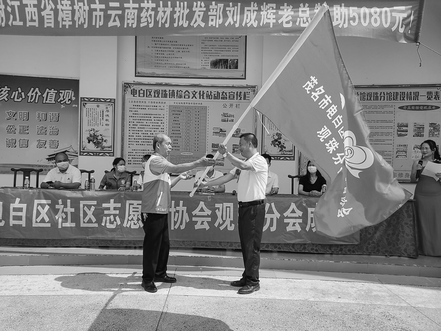 仪式上,宣读了关于同意成立电白区社区志愿者协会观珠分会的批复,电白区社区志愿者协会会长黄绿飞为观珠分会授旗(如右图),现场还举行了揭牌、颁发聘书、为帮扶对象派送粮油、为爱心人士颁发牌匾等环节。