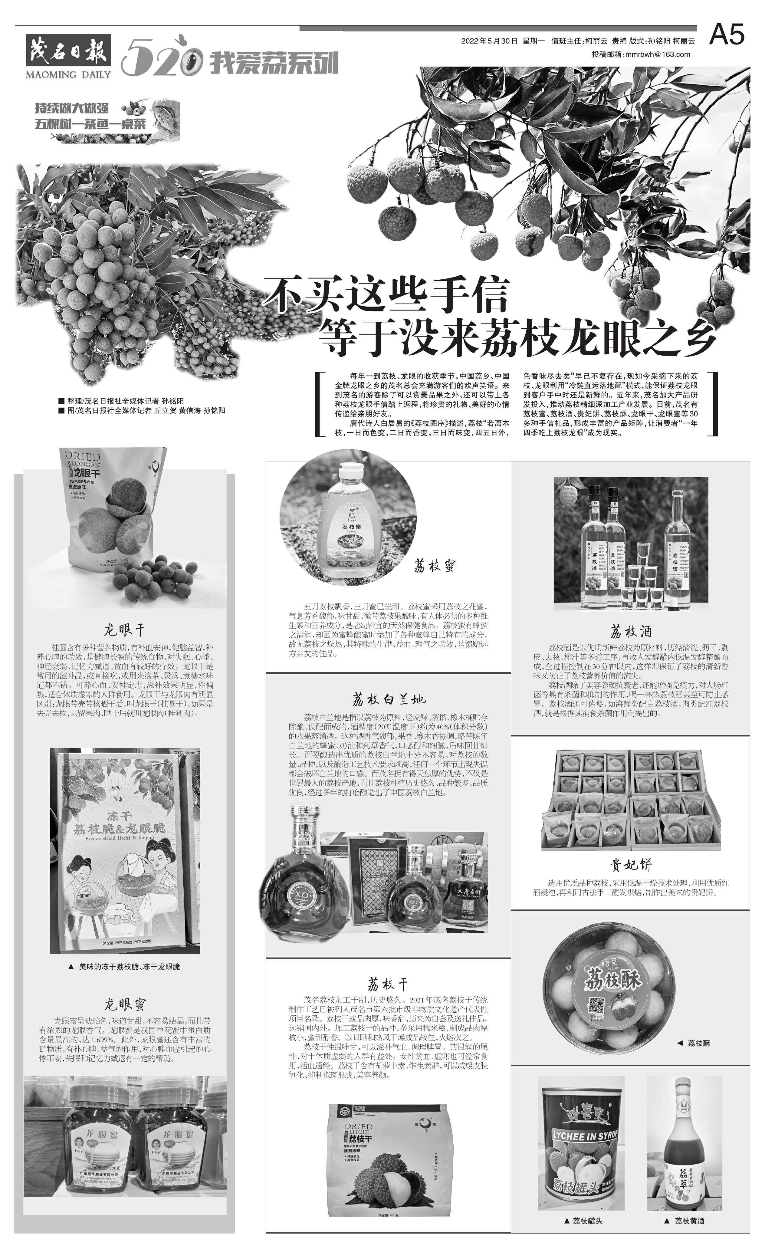 唐代诗人白居易的《荔枝图序》描述,荔枝“若离本枝,一日而色变,二日而香变,三日而味变,四五日外,色香味尽去矣”早已不复存在,现如今采摘下来的荔枝、龙眼利用“冷链直运落地配”模式,能保证荔枝龙眼到客户手中时还是新鲜的。近年来,茂名加大产品研发投入,推动荔枝精细深加工产业发展。目前,茂名有荔枝蜜、荔枝酒、贵妃饼、荔枝酥、龙眼干、龙眼蜜等30多种手信礼品,形成丰富的产品矩阵,让消费者“一年四季吃上荔枝龙眼”成为现实。