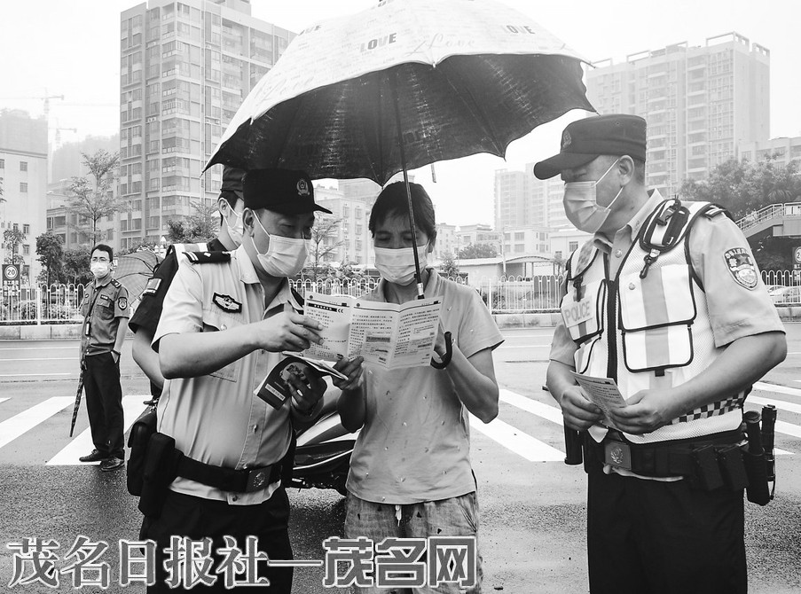 在高考期间,化州市连日普降暴雨。党员民警贴心地为没有带伞的考生撑伞挡雨,护送他们顺利进入考场参加考试;