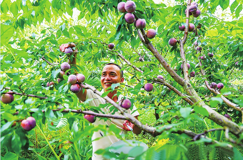 三华李丰收季的到来,钱排镇漫山遍野的三华李树,挂满了红里带紫、银霜裹面的银妃三华李。果农们每天多次到果园摘果,进行线上线下销售(如图)。