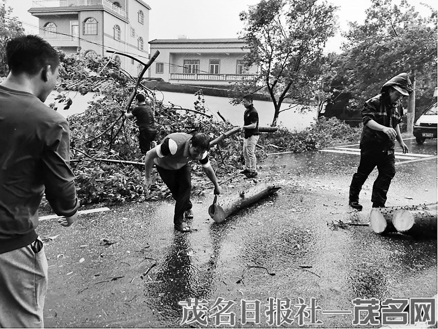 昨日下午,台风“暹芭”在电白登陆,在电白区七那线观珠镇大榕村段的公路两侧,多棵树木被吹断,堵住了往来的车辆。大榕村穿着红色志愿者马甲的党员干部和网格员应急队一起合力清理断裂的树枝。