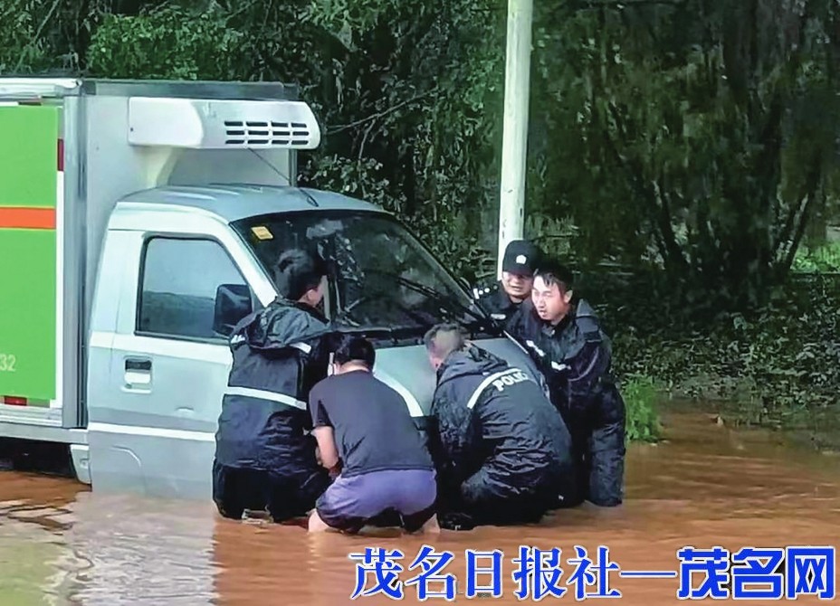 公安民警冒雨协助市民救援受困车辆。茂名日报社全媒体记者岑稳摄