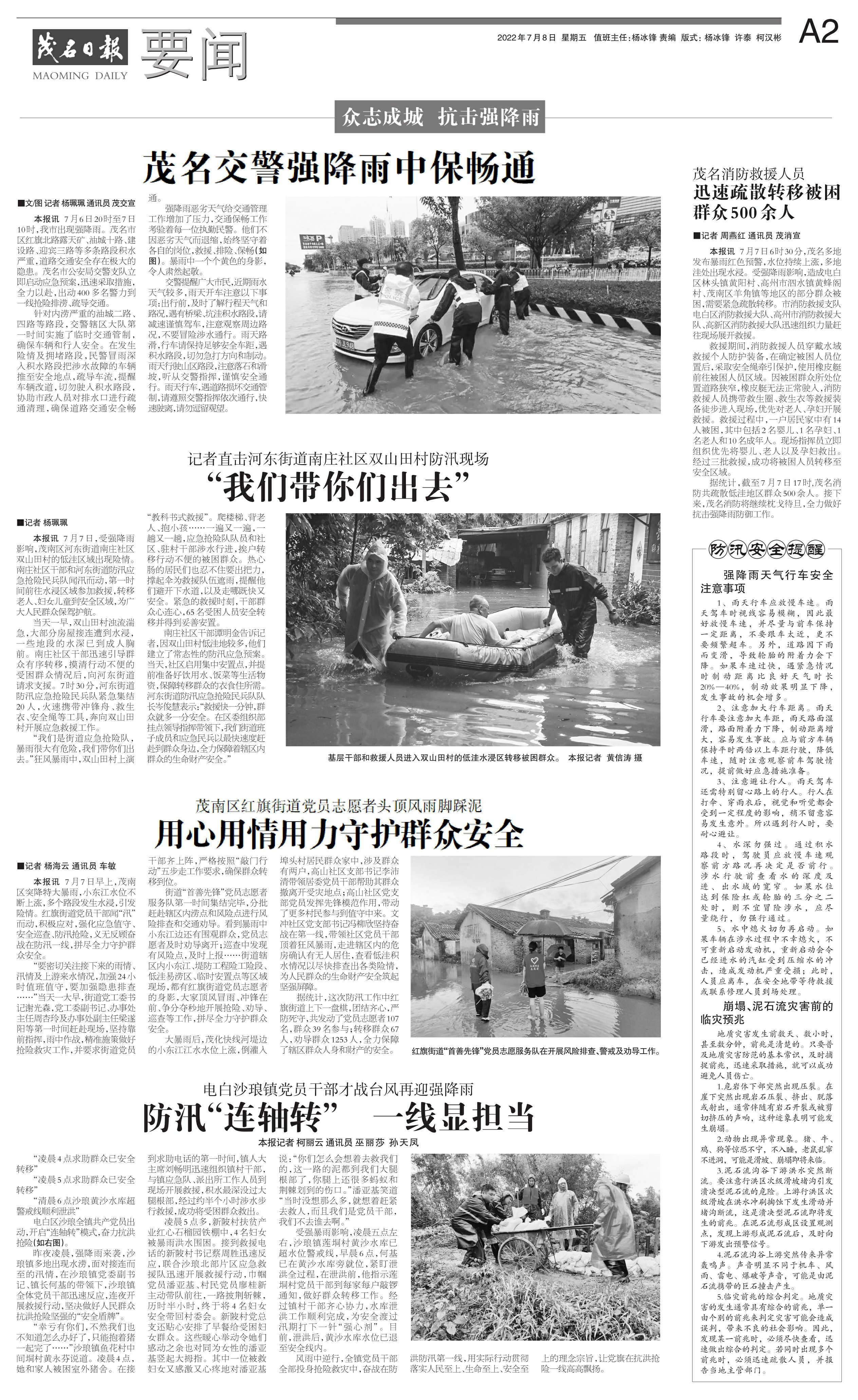 本报讯 7月7日,受强降雨影响,茂南区河东街道南庄社区双山田村的低洼区域出现险情。南庄社区干部和河东街道防汛应急抢险民兵队闻汛而动,第一时间前往水浸区域参加救援,转移老人、妇女儿童到安全区域,为广大人民群众保驾护航。
