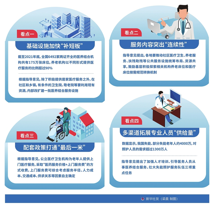 “指导意见提出了加强人才培训、引导医务人员从事医养结合服务、壮大失能照护服务队伍三项重点任务。”国家卫生健康委卫生发展研究中心研究员郝晓宁说,这是推动人才队伍提量提质的一揽子措施,有望吸引更多人才参与到医养结合服务中。
