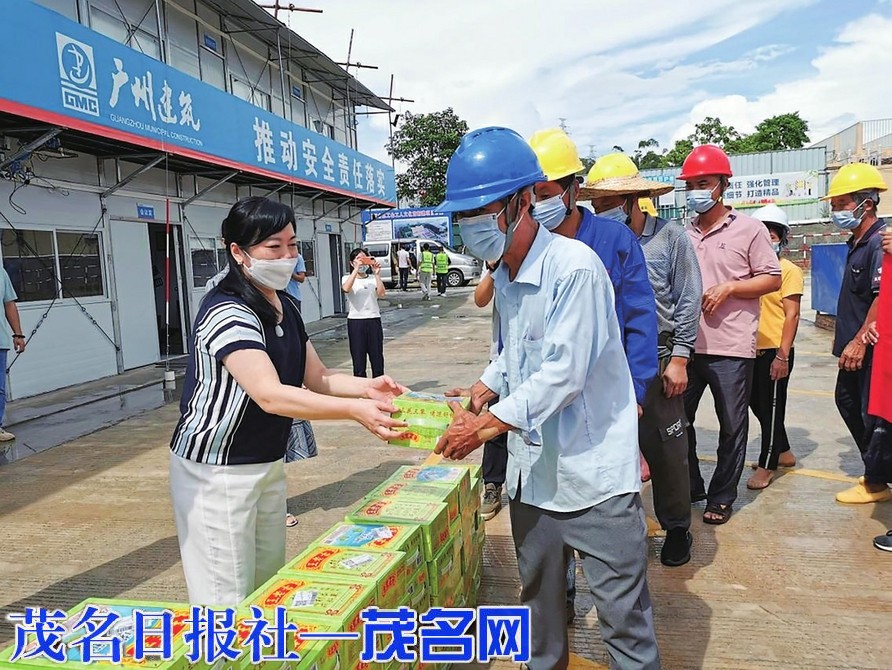 高州市总工会向该市工人文化宫新建项目工地建筑工人送上清凉饮料。黄浩诗摄
