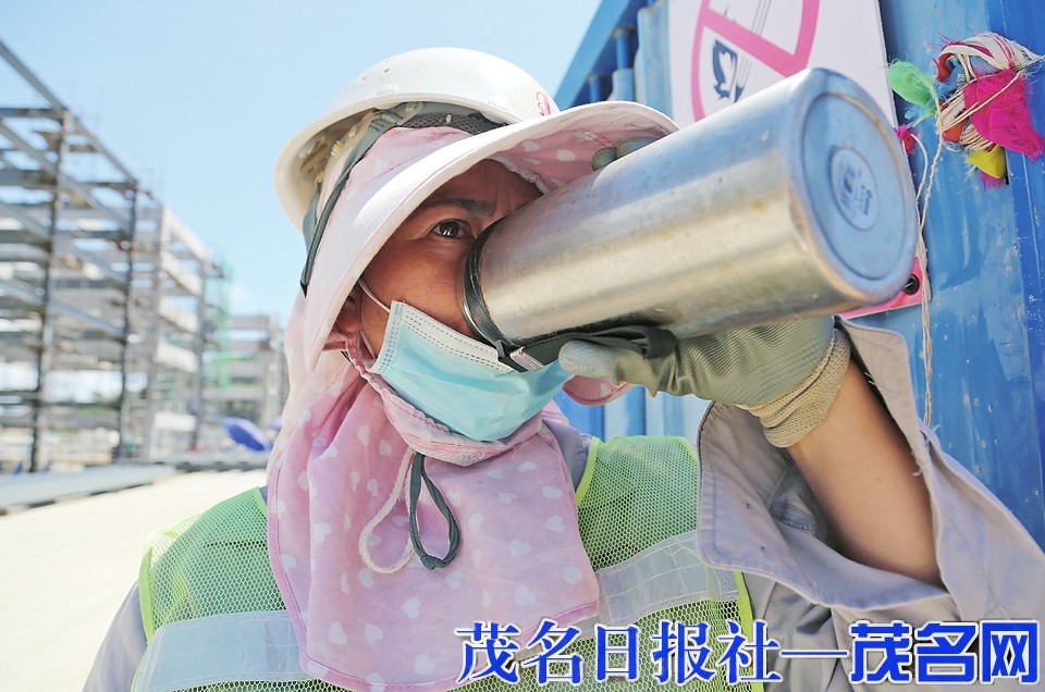 利用工作间隙,饮水消暑降温。茂名日报社全媒体记者岑稳摄