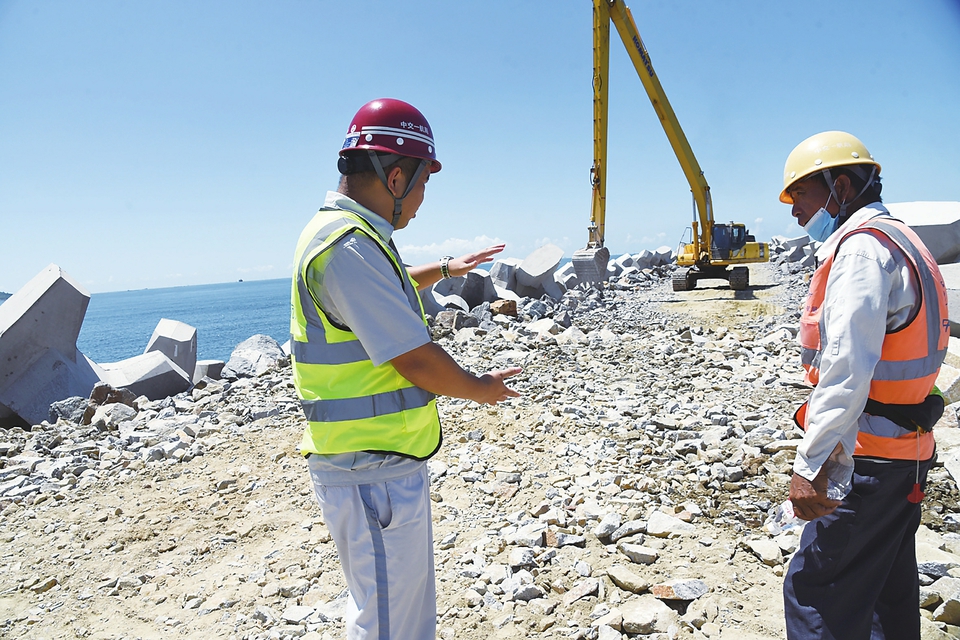 近日,茂名港吉达港区防波堤一期工程项目工地上,施工人员顶着烈日高温进行施工。据了解,该防波堤全长约5568米,主要用于掩护规划的部分东一港池、东二港池、东三港池。防波堤最大水深约13米,结构采用抛石斜坡堤方案。项目建成后将为茂名港吉达港区后续相关建设提供便利,带动周边区域经济发展,助力茂名市博贺新港区建设。本报记者黄信涛摄