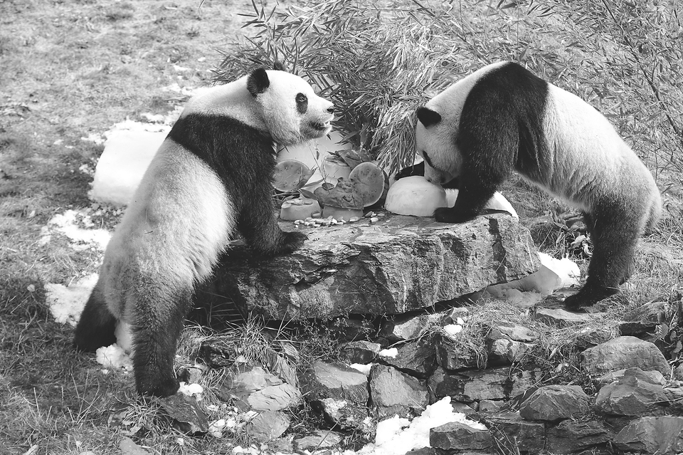 8月6日,在比利时布吕热莱特的天堂动物园,大熊猫“宝弟”(左)、“宝妹”享用“生日大餐”。