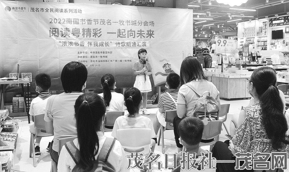 本报讯 昨日,“浓浓书香,伴我成长”诗歌朗诵汇演在2022南国书香节茂名一牧书城分会场举行,一群5-12岁的小读者聚在一起,以诗歌朗诵的方式,(如右图,茂名日报社全媒体记者陈国汉摄)喜迎2022南国书香节茂名分会场启幕。