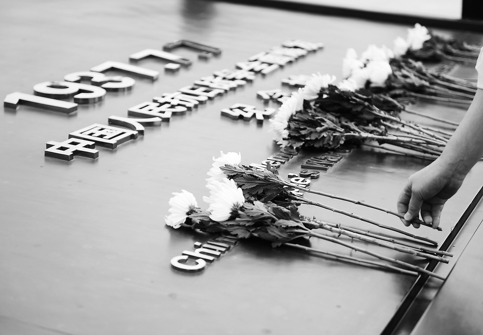 9月18日,中国人民抗日战争纪念馆的工作人员向独立自由勋章雕塑献花。 当日,中国人民抗日战争纪念馆举行“铭记历史勿忘九一八”主题活动,旨在回望历史、追思先烈,警示人们勿忘国耻、以史为鉴、珍爱和平。 新华社记者张晨霖摄