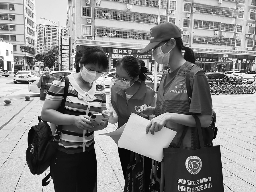 志愿者邀请市民参与创建全国文明城市问卷调查的填写。