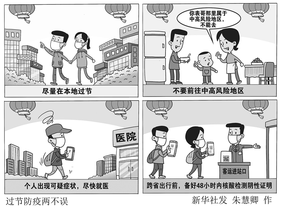 国家疾控局传染病防控司司长雷正龙提醒广大群众,尽量在本地过节,尽量减少跨地市出行,避免人群大范围流动引发的疫情传播风险。如果确需出行,要了解目的地的疫情情况,不要前往中高风险地区所在的县区。出行前要做好个人健康监测,如果出现可疑症状,要及时取消出行计划,并尽快就医。交通运输部运输服务司副司长韩敬华表示,假期出行前要及时查询掌握目的地的防疫政策,乘坐客运车辆跨省出行前,备好48小时内核酸检测阴性证明。