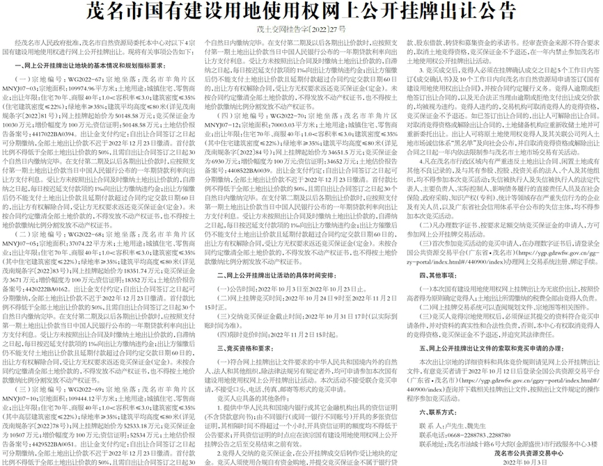 茂名市国有建设用地使用权网上公开挂牌出让公告