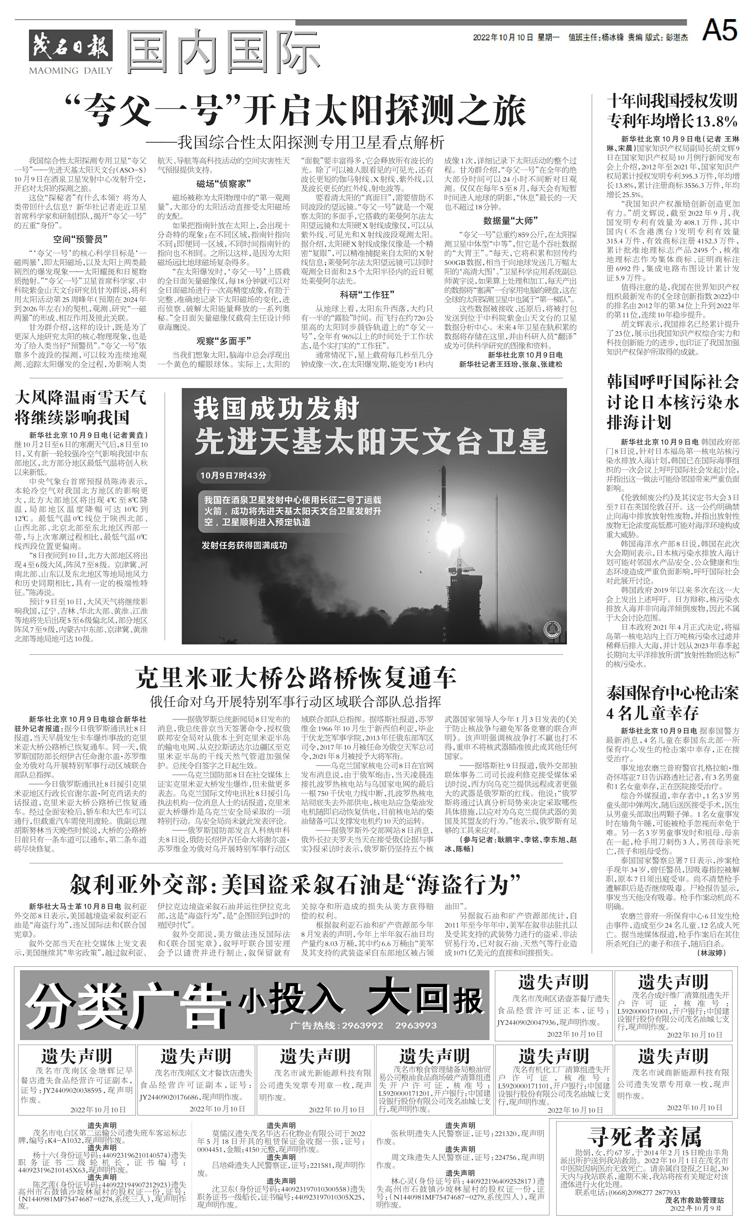 我国成功发射先进天基太阳天文台卫星