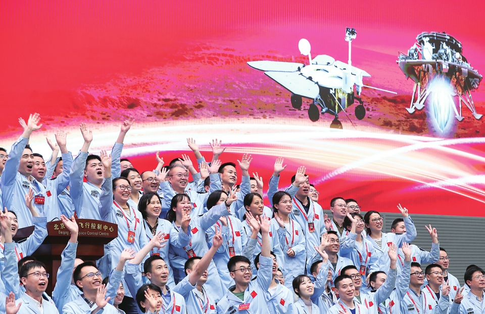 2021年5月15日7时18分,天问一号着陆巡视器成功着陆于火星乌托邦平原南部预选着陆区,我国首次火星探测任务着陆火星成功。这是航天科研人员在北京航天飞行控制中心指挥大厅庆祝。 新华社记者金立旺摄