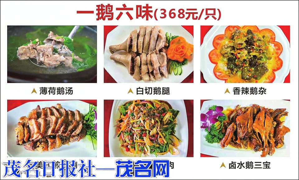 迁谷农庄有四大菜色,包括瘦身皖鱼、广西黑土鸭、一鹅六味、贵妃凤阉鸡等,其中又以一鹅六味最负盛名。所谓一鹅六味,是用一只鹅做出6种不同风味的佳肴。迁谷创始人陈秋雄告诉记者,他是从传统名肴“全猪宴”得到了灵感,然后结合茂名人的饮食爱好,设计出了这种特别的菜色。“薄荷鹅汤、白切鹅腿、香辣鹅杂、美式煎鹅腩、凉拌鹅脖肉、卤水鹅三宝,6道菜6种风味,有煎有炒有炖,有白切有香辣有卤水,满足不同口味的需求。”