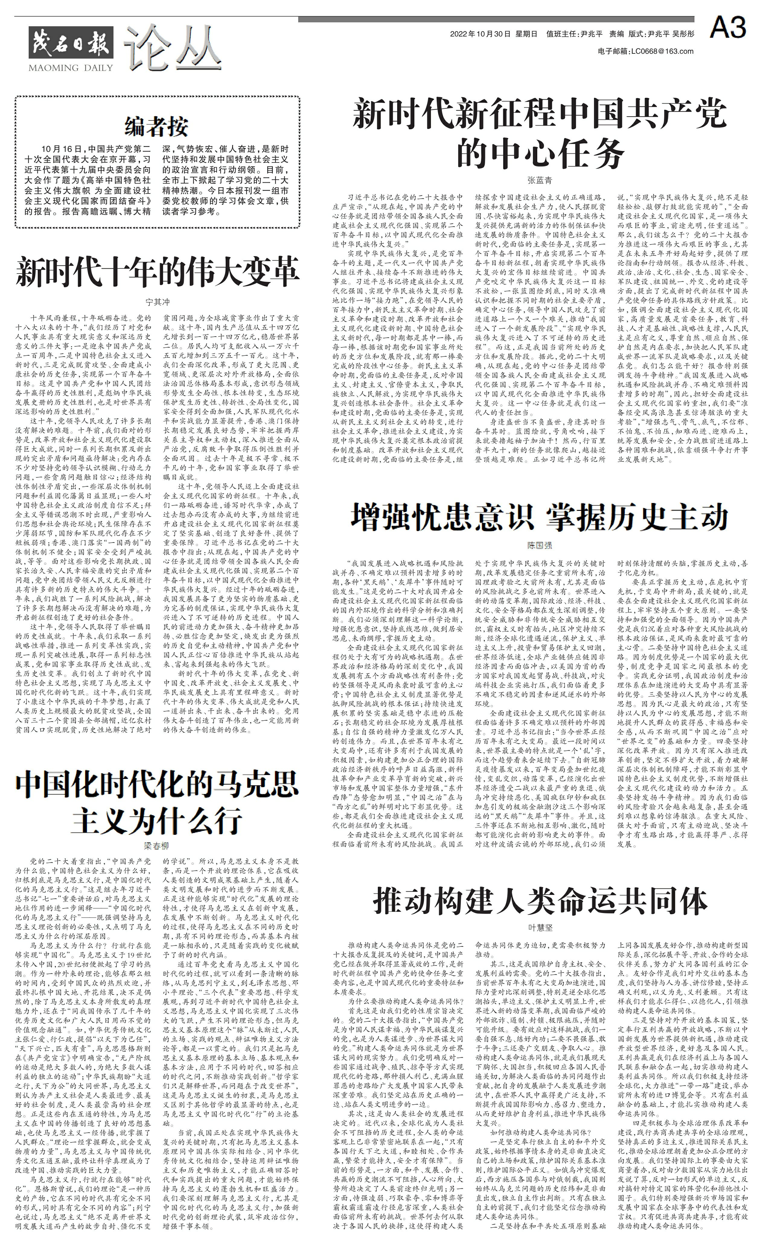 10月16日,中国共产党第二十次全国代表大会在京开幕,习近平代表第十九届中央委员会向大会作了题为《高举中国特色社会主义伟大旗帜为全面建设社会主义现代化国家而团结奋斗》的报告。报告高瞻远瞩、博大精深,气势恢宏、催人奋进,是新时代坚持和发展中国特色社会主义的政治宣言和行动纲领。目前,全市上下掀起了学习党的二十大精神热潮。今日本报刊发一组市委党校教师的学习体会文章,供读者学习参考。