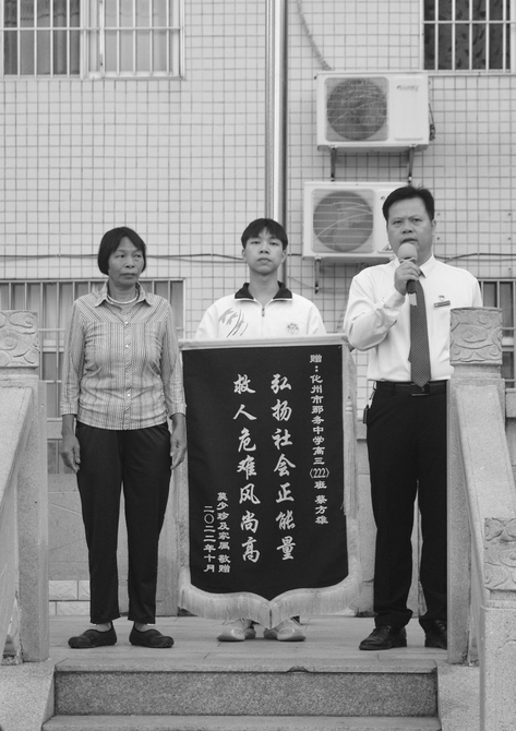 在学校每周例行的升旗仪式上,蔡方雄同学在全校师生的目光中走上升旗台前,老奶奶的家属送上了感谢信和锦旗,表达了对蔡方雄同学万分谢意,还对注重培养学生优秀品质的那务中学表示感谢。