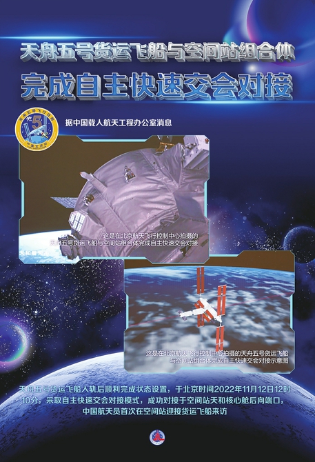 天舟五号货运飞船在火箭点火起飞后约2个小时,顺利与在轨运行的空间站组合体进行自主快速交会对接,这是空间站建造阶段最快速的交会对接,标志着我国快速交会对接技术成功在轨验证。