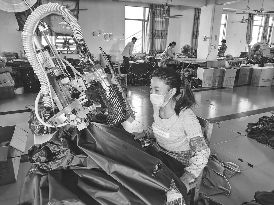 本报讯早上八时,在电白区霞洞镇的羊黄路旁,不时有一辆辆大货车驶出,那是当地五羊雨衣厂的运输车,正在将产品送往各地。据了解,受疫情影响,该厂产品运输一度滞阻,如今随着疫情防控形势好转,该厂已经全面复工复产,200多名工人已全部上岗,大家戴着口罩,在各自的岗位上,有序地忙碌着。