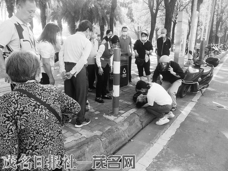 本报讯昨日9时许,在茂名市南香公园路边,有一名老人突然晕倒,心跳、呼吸、意识全无,情况危急。就在此时,人群中忽然传来一句“我是医生,让我来!”一名女子迅速赶来,察看老人情况后,立即跪地为患者进行心肺复苏,一分钟、两分钟、三分钟……老人的心脏渐渐恢复了跳动,在危急时刻老人得到了及时的救助。