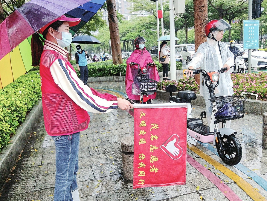 昨日,记者在市区油城路与西粤路交汇处路口看到,志愿者手持文明交通劝导旗,冒雨协助交警维持交通秩序,营造文明有序的交通环境。