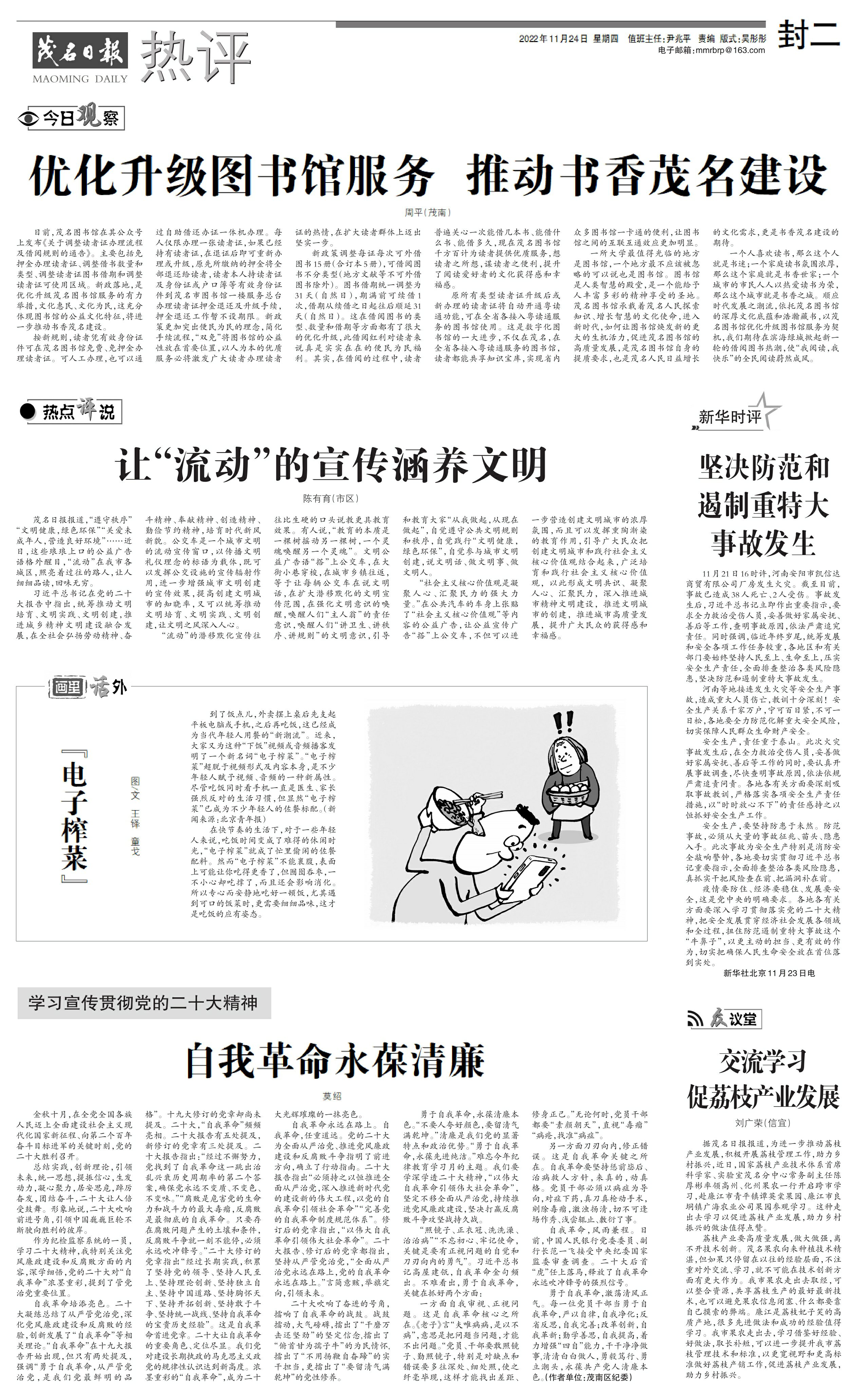 勇于自我革命,激荡清风正气。每一位党员干部当勇于自我革命,严以自律,自我净化;反省反思,自我完善;改革创新,自我革新;勤学善思,自我提高,着力增强“四自”能力,干干净净做事,清清白白做人,勇毅笃行、勇立潮头,永葆共产党人清廉本色。(作者单位:茂南区纪委)