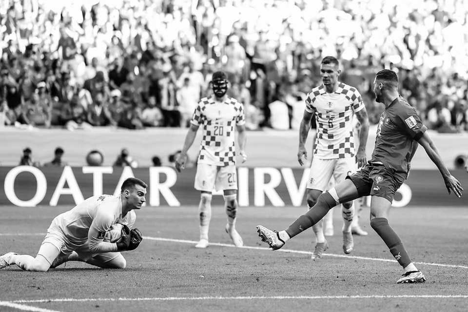 上半场临近伤停补时阶段,克罗地亚队终于在进攻上有了些起色。索萨左路横传,弗拉西奇中路跟上后近在咫尺的射门被摩洛哥守门员布努用腿挡出,这也是上半场双方创造的最好得分机会。