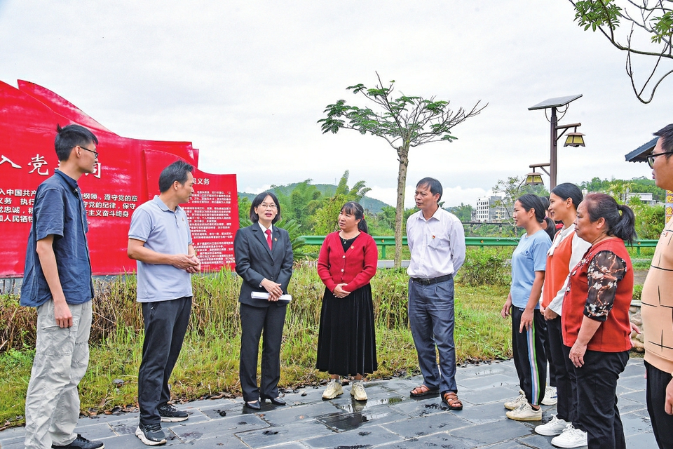 在信宜市水口镇高岭村,彭秋香与当地群众围绕党的二十大精神进行学习交流分享。 茂名日报社全媒体记者 黎雄摄