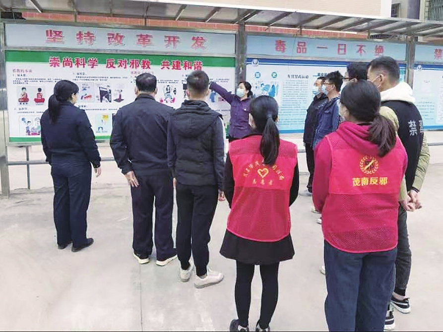图为镇盛镇工作人员向群众讲解反对邪教普法宣传教育。