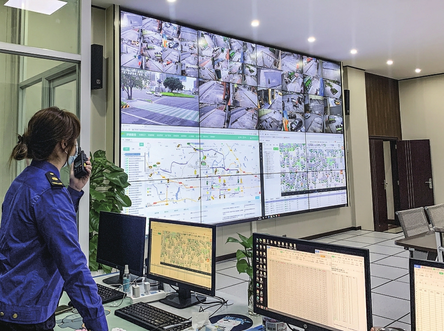 智慧城管指挥中心,对城市管理一线工作实行实时远程监控,实现及时统一调度。