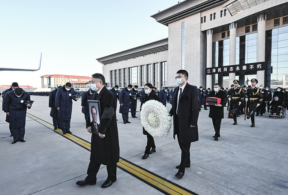 12月11日,遵照江泽民同志及其亲属的意愿,敬爱的江泽民同志的骨灰在长江入海口撒入大海。受党中央委托,中共中央政治局常委、中央书记处书记蔡奇等领导同志和江泽民同志的夫人王冶坪等亲属护送骨灰撒放。这是在北京西郊机场,江泽民同志的亲属捧着遗像、骨灰盒和花圈,缓步走向专机。新华社记者燕雁摄