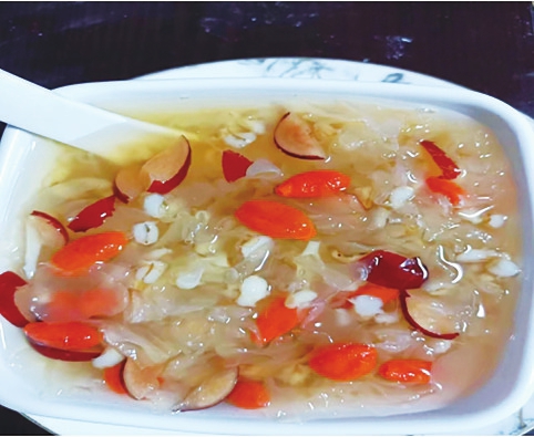 清补凉的主要食材为薏米、雪耳、玉竹、红枣、杞子、糖。首先把薏米煮好,洗清,雪耳泡好剪碎,红枣、玉竹剪碎,雪耳、红枣、杞子漂下水,再控干备用,再放冰片糖,最后将所有材料进去煮开。这糖水能清热去湿,清甜滋补,是夏天必不可少的甜品之一。