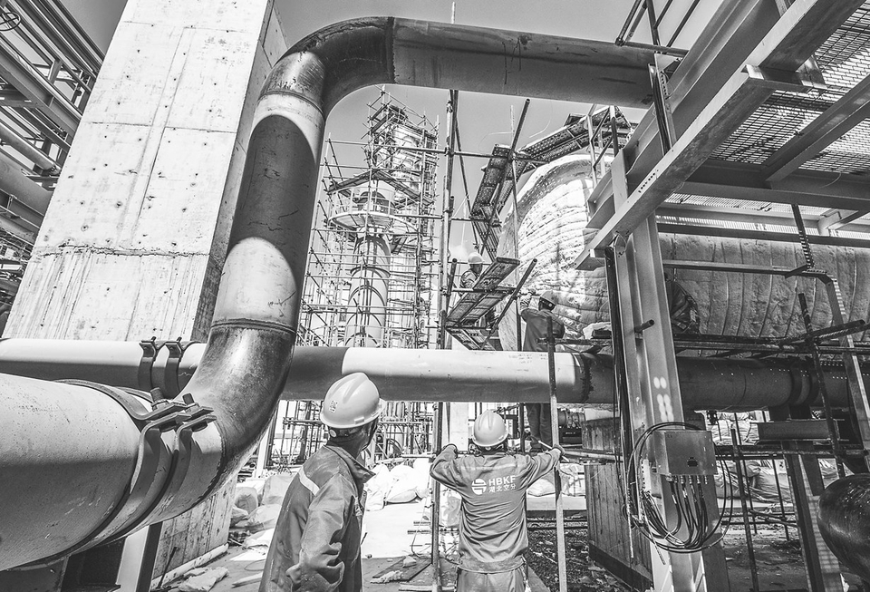 技术人员在各个部件之间来回行走,反复检查试车情况。工人们表示,在建设工地迎接即将到来的兔年春节,很有意义。 本报记者 丘立贺 摄