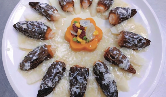 羊肚菌酿虾滑是电白沿海特色家常菜之一,口感爽滑,肉质饱满,格外的“鲜”,是电白海边人家聚餐、款待客人常备菜式。羊肚菌酿虾滑的主要食材为羊肚菌、虾滑、淮山等,将羊肚菌浸泡一会洗净,挤入虾滑,和淮山摆好放进蒸笼蒸熟后拿出,最后将准备好的南瓜、百合、玉米等进行最后的摆盘,再淋上酱汁即可。