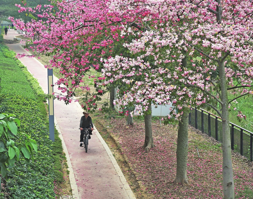 骑行、奔跑、漫步……记者看到,在这条被粉色花朵点缀的路上,人们有着各自的节奏与享受。运动爱好者与自行车作伴,在碧道上尽情放飞好心情。家长陪着小朋友一路奔跑,拥抱心花怒放的好时光。老伴侣恩爱牵手、小情侣十指紧扣,缓缓走向幸福甜蜜的好生活。