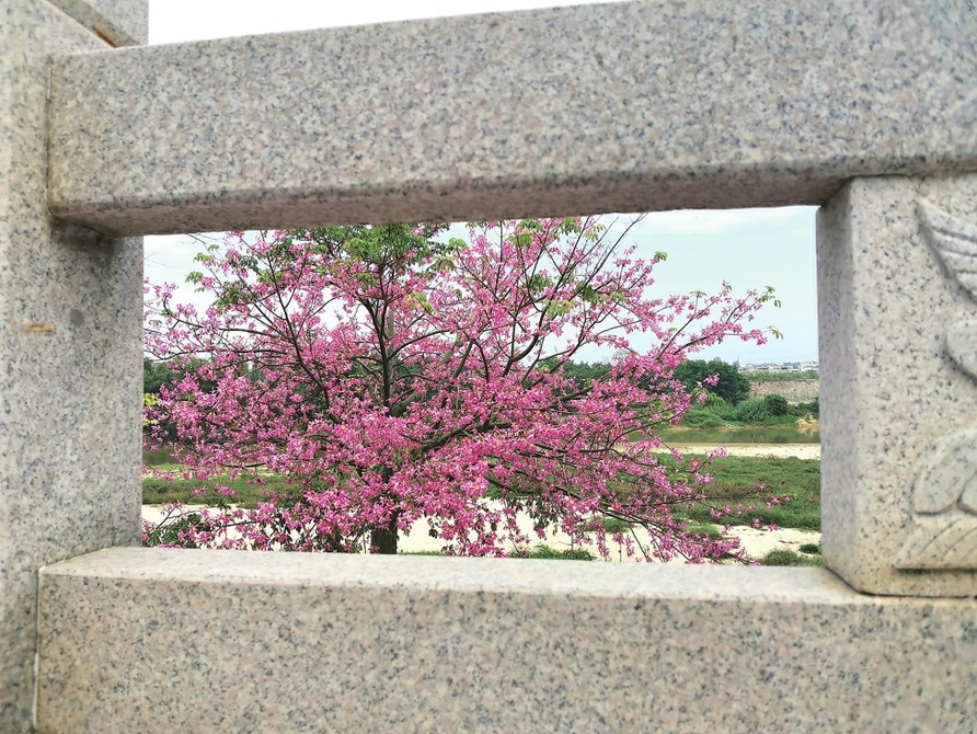 透过栏杆欣赏异木棉花,自成一景。