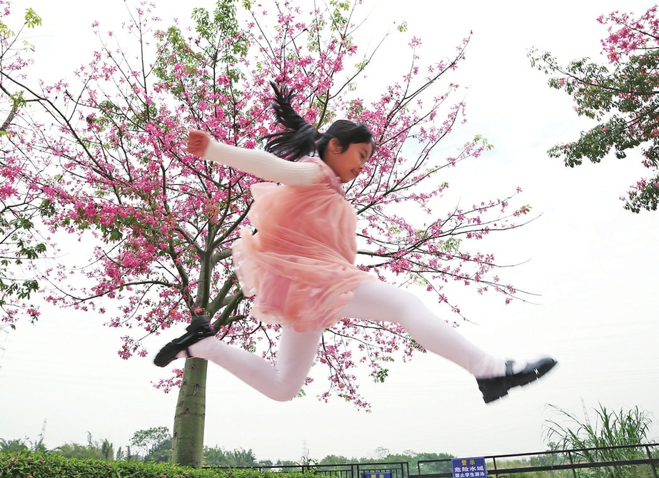 一名小女孩在异木棉花下起舞。