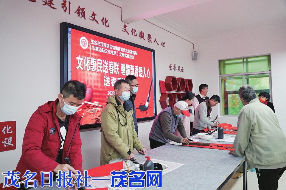 本报讯春节即将到来,茂南区公馆镇新时代文明实践所举行了一系列文化惠民活动。1月10日上午,公馆镇新时代文明实践所内墨香流动,室外的空气虽然很冷,雨也很大,但是在这喜庆的屋子内却是洋溢着满满的暖意。多名茂名市著名书法家正在不停地挥毫泼墨,为群众写春联(如图,通讯员林凡曹华区摄),填祝福,为即将到来的新年增添彩头。1月11日,公馆镇新时代文明实践所还举办了2023年迎春系列活动暨迎春曲艺演出活动。连续举办的迎春文化惠民活动,丰富了公馆镇群众春节前的文化生活。