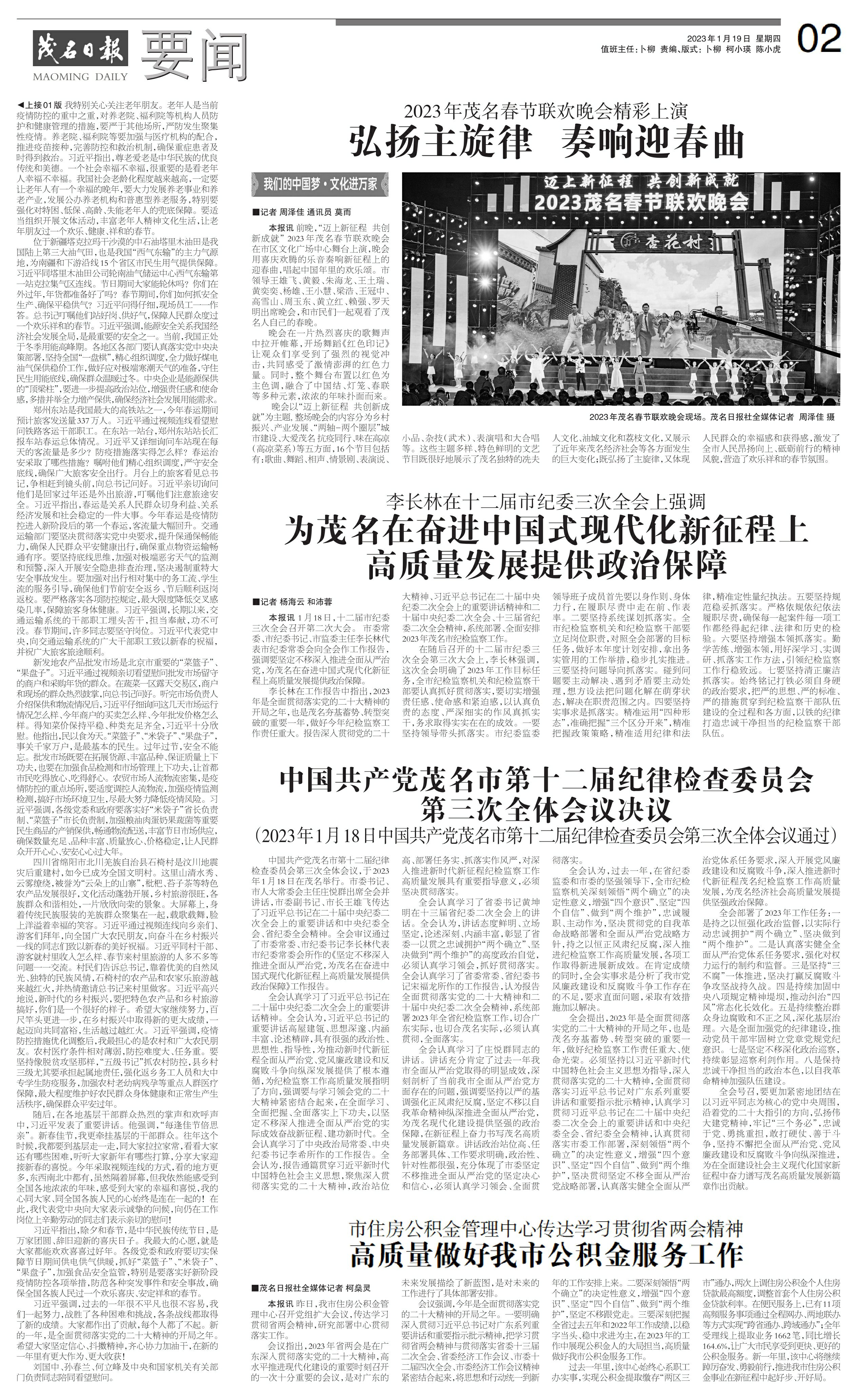 本报讯前晚,“迈上新征程 共创新成就”2023年茂名春节联欢晚会在市区文化广场中心舞台上演,晚会用喜庆欢腾的乐音奏响新征程上的迎春曲,唱起中国年里的欢乐颂。市领导王雄飞、黄毅、朱海龙、王土瑞、黄奕奕、杨雄、王小慧、梁浩、王冠中、高雪山、周玉东、黄立红、赖强、罗天明出席晚会,和市民们一起观看了茂名人自己的春晚。