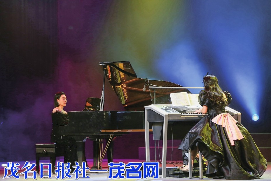 婉转而悠扬的钢琴声与双排键声环绕在舞台上,观众们聚精会神地欣赏着。在2023“好心茂名”少儿春晚的节目中,这个音乐表演颇为新颖,它就是新兴的电子乐器双排键与资深传统乐器钢琴组合,由梁梓祺与何欢共同演奏的《假面舞会》。