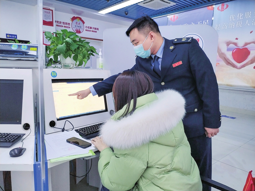 图为税务人员正在辅导纳税人登陆电子税务局办理相关涉税业务。 通讯员吴秋颖摄