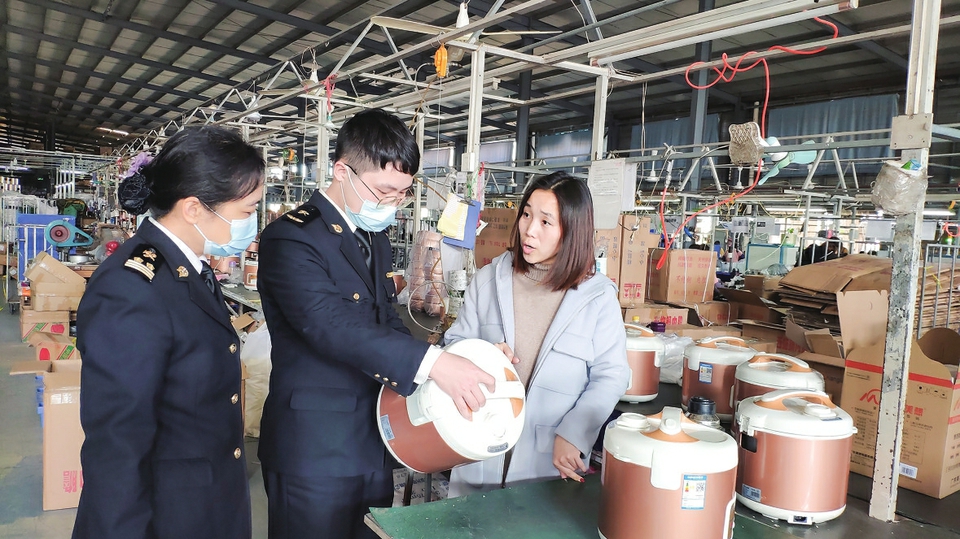 茂名海关关员深入出口电饭煲企业调研指导。通讯员曾少敏摄