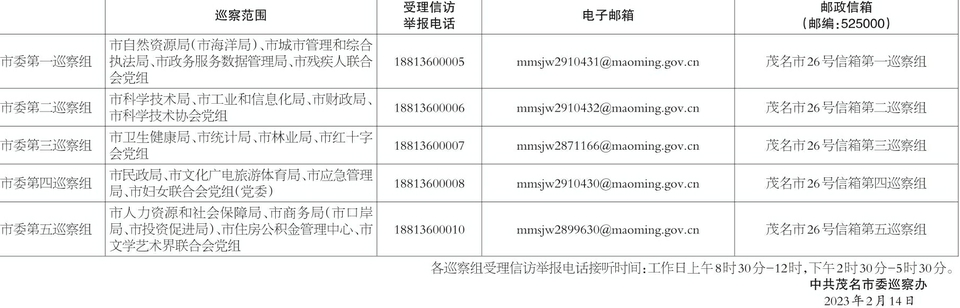 根据市委巡察工作统一部署,市委巡察组于2023年2月中旬至2023年6月中旬对市科学技术局、市工业和信息化局、市民政局、市财政局、市人力资源和社会保障局、市自然资源局(市海洋局)、市商务局(市口岸局、市投资促进局)、市文化广电旅游体育局、市卫生健康局、市应急管理局、市统计局、市城市管理和综合执法局、市政务服务数据管理局、市林业局、市住房公积金管理中心、市妇女联合会、市科学技术协会、市文学艺术界联合会、市残疾人联合会、市红十字会等20个单位党组织开展巡察。