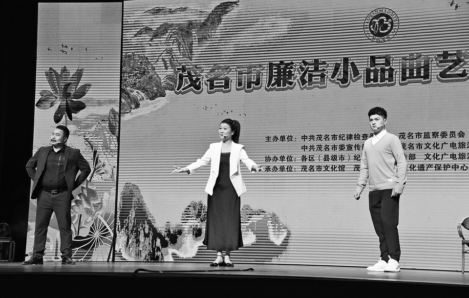 本报讯为弘扬中华民族优秀传统文化,充分发挥廉洁文化的引领作用,积极营造我市崇廉尚洁的社会氛围,前晚,茂名市廉洁小品曲艺创作大赛决赛在茂名影剧院上演(如右图),也拉开了今年我市推进廉洁文化建设的序幕。市直相关单位和各区(县级市)、滨海新区、高新区、水东湾新城的广大干部职工一起观看了表演。