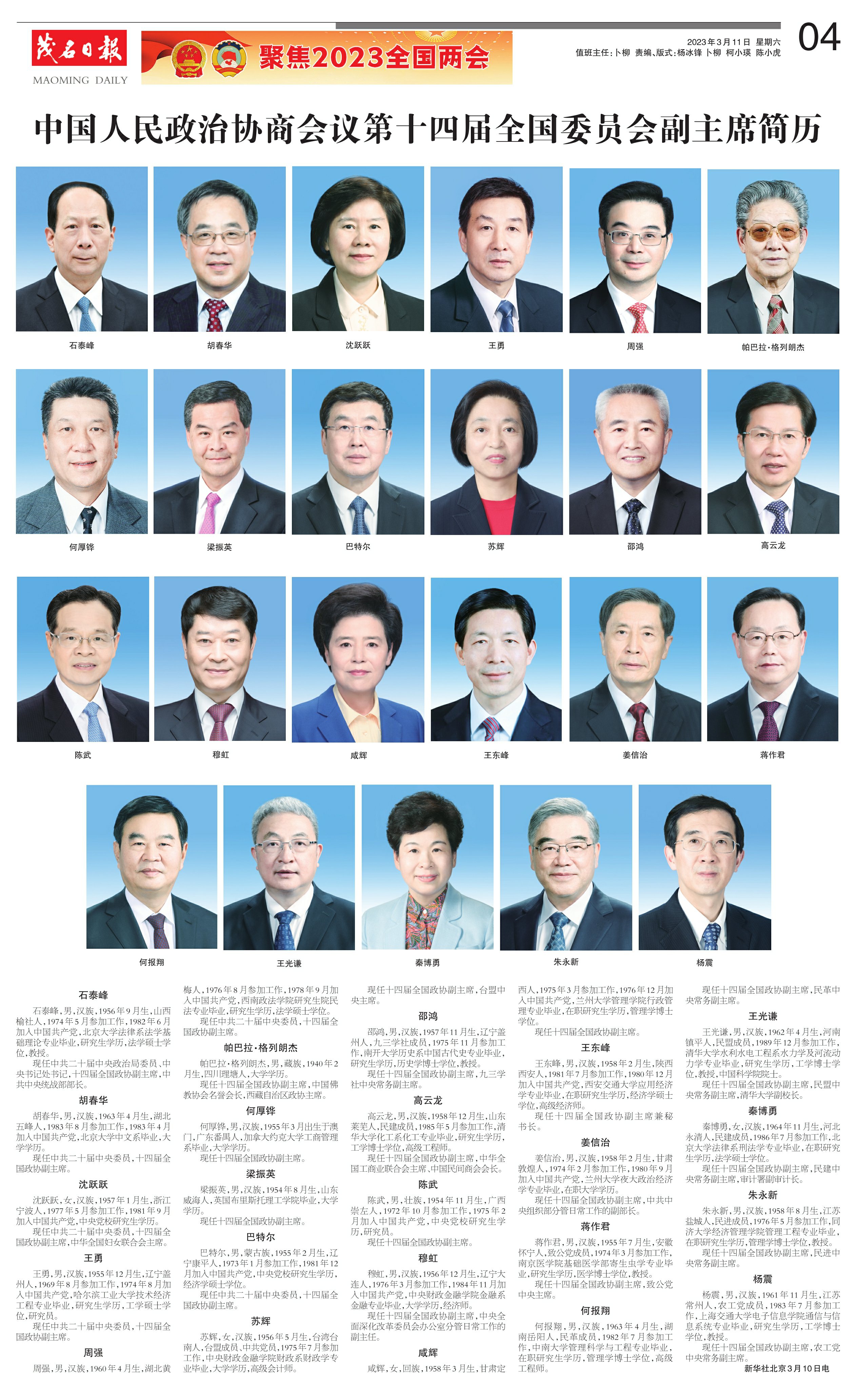 中国人民政治协商会议第十四届全国委员会副主席简历